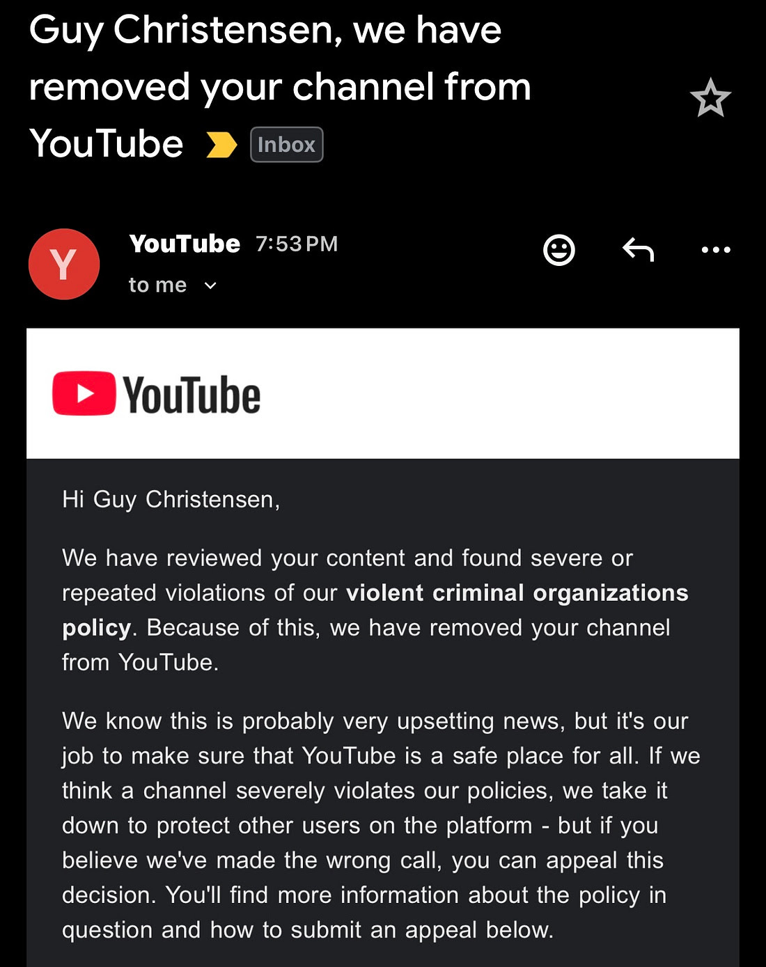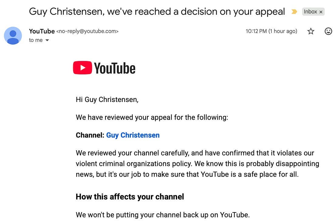 YouTube immediately denied my appeal.